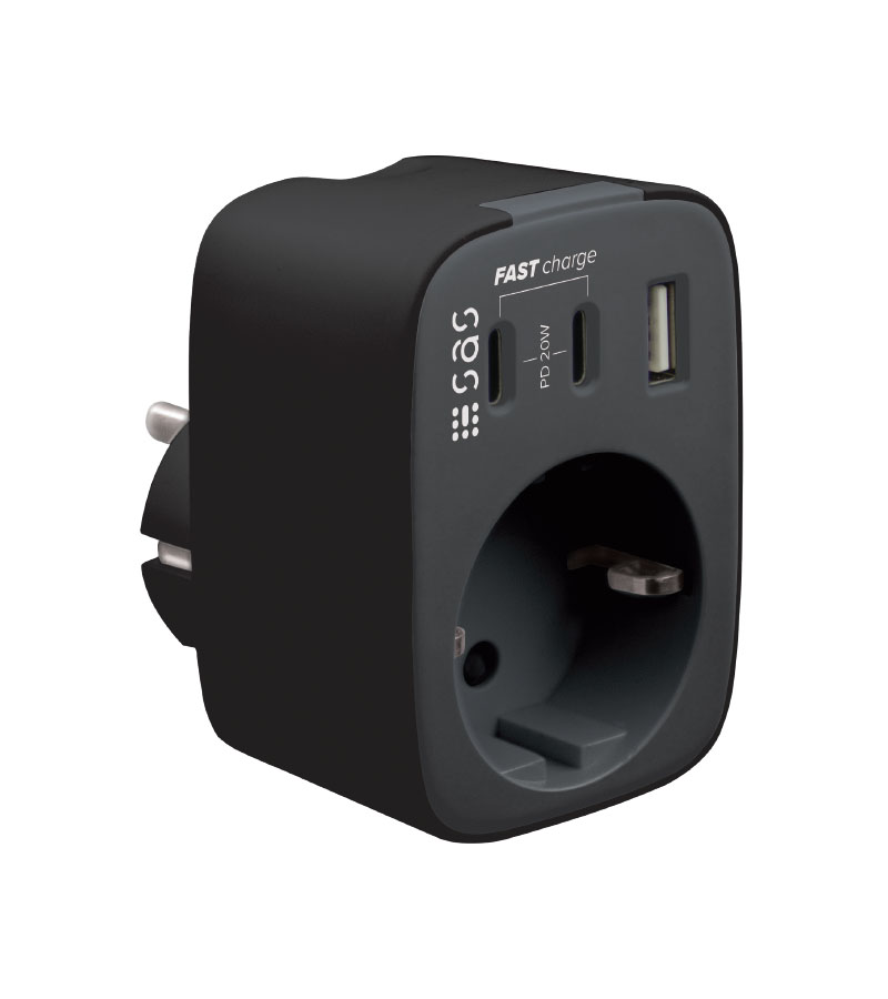 Ο φορτιστής Fast Charge σε μαύρο χρώμα συνδυάζει 2 θύρες USB-C, θύρα φόρτισης USB-A , με τεχνολογία Quick Charge 3.0 (USB - A) και Power Delivery (PD) έως 20W (Type – C) για γρήγορη και ασφαλή φόρτιση όλων των συσκευών σας, καθώς και 1 σούκο ρεύματος.